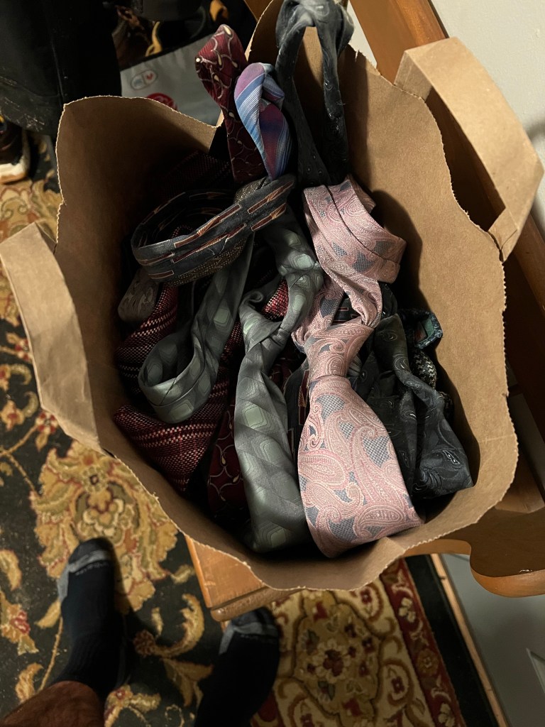 Realizing that many people wouldn’t have ties, I cleaned out my closet last night and brought in a bag full.
